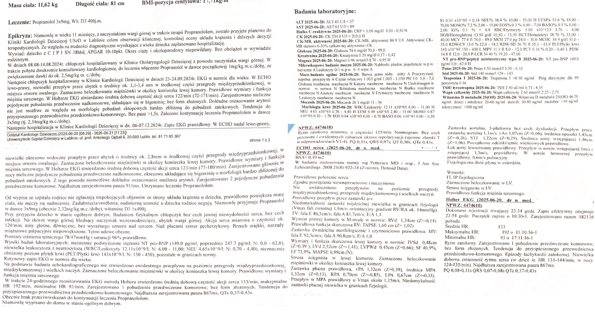 Syn urodził się 18.07.2024r. z naczyniakiem na górnej wardze. Obecnie jest w trakcie terapii Propranololem. Czterokrotnie hospitalizowany w szpitalu dziecięcym w Lublinie. Pierwszy raz w wieku 2tygodni (od 08.08.24 do 14.08.24) z powodu nagłego rozrostu i owrzodzenia naczyniaka, w Klinice Otolaryngologii Dziecięcej. Dawka początkowa leku 1mg/kg m.c./dobę. Owrzodzenie spowodowało ubytek na wardze, który do dzisiaj jest widoczny.Kolejne hospitalizacje odbyły się w Klinice Kardiologii Dziecięcej (09.24r., 12.24r., 06.25r.) w celu obserwacji klinicznej kontrolnej oceny układu krążenia i dalszych decyzji terapeutycznych.